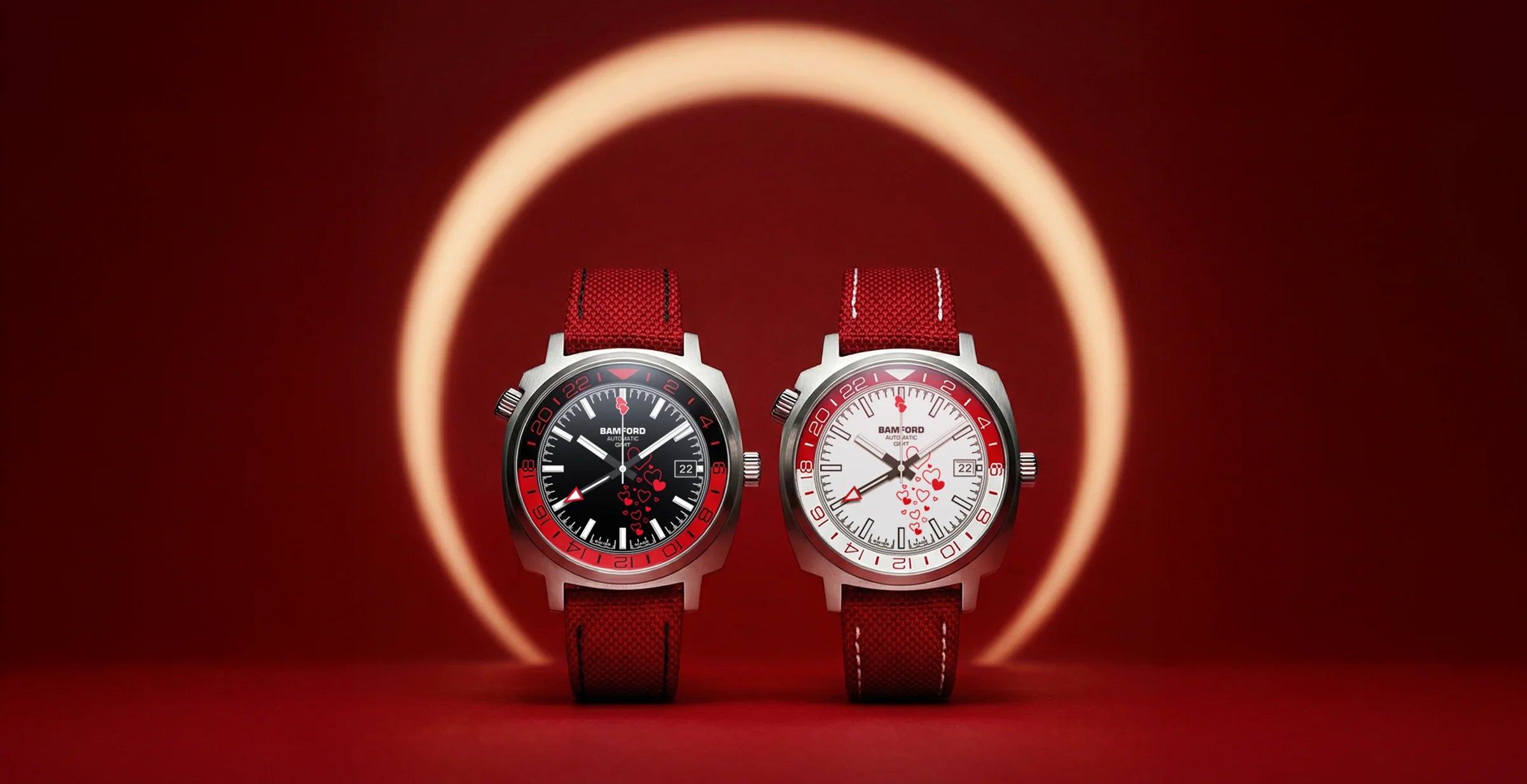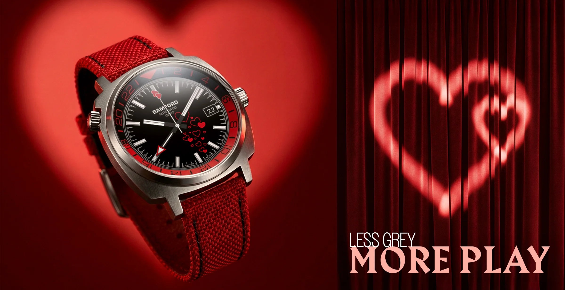 This Valentine edition is based on the GMT model, combining dual-time functionality with a bold seasonal configuration.