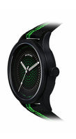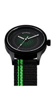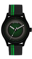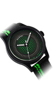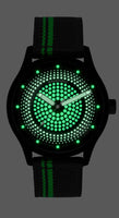 Encased in black titanium, this extraordinary timepiece features a unique two-layer dial. The top layer with a with a cut-through circular pattern, reveals the vibrant green and white hues of the underlying layer, creating an unmatched texture and depth. Complemented by a 20mm black nylon strap with a green racing stripe and a quick release system.